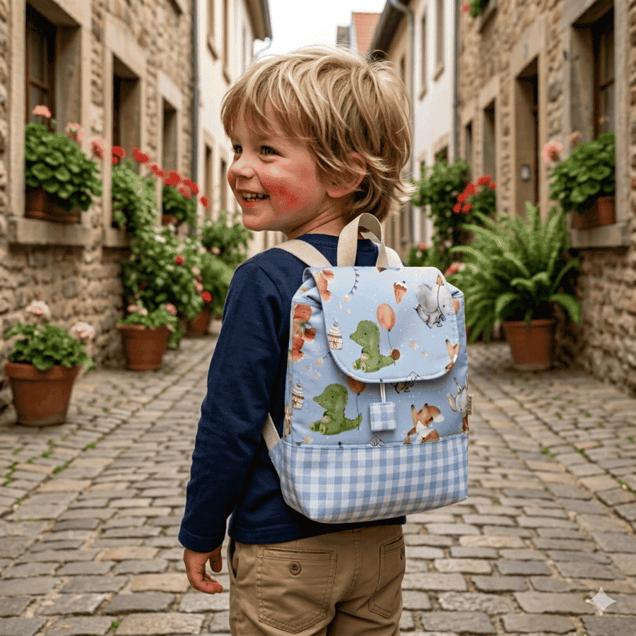 Mochila para Niños Personalizada Dinosaurios modelo SOLAPA en tamaño MINI, ideal para guardería o escuela infantil. Hecha a mano en telas de algodón en el exterior, tejido impermeable en el interior y con nombre bordado a mano incluido.