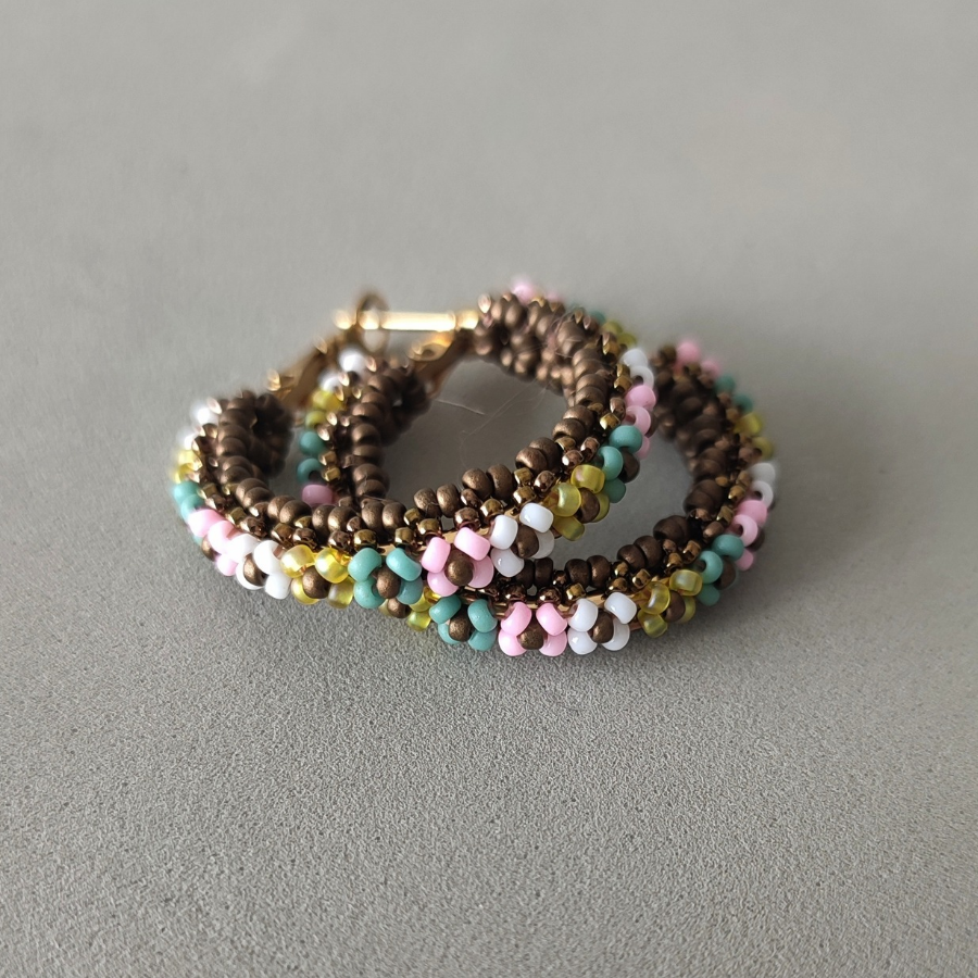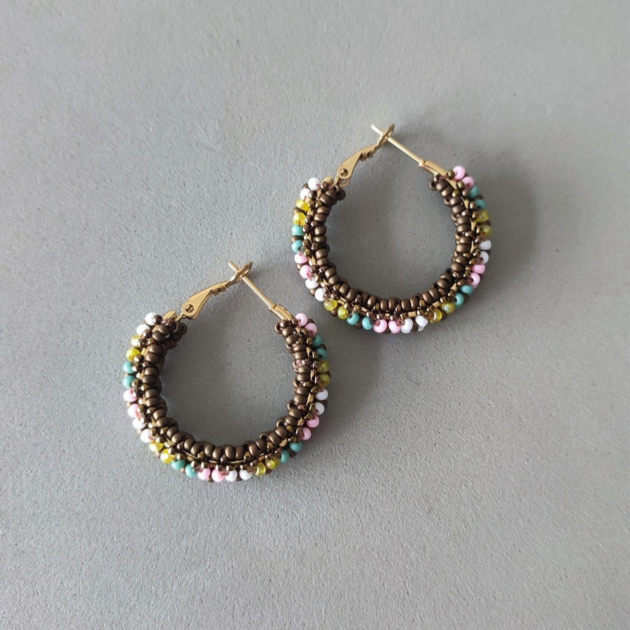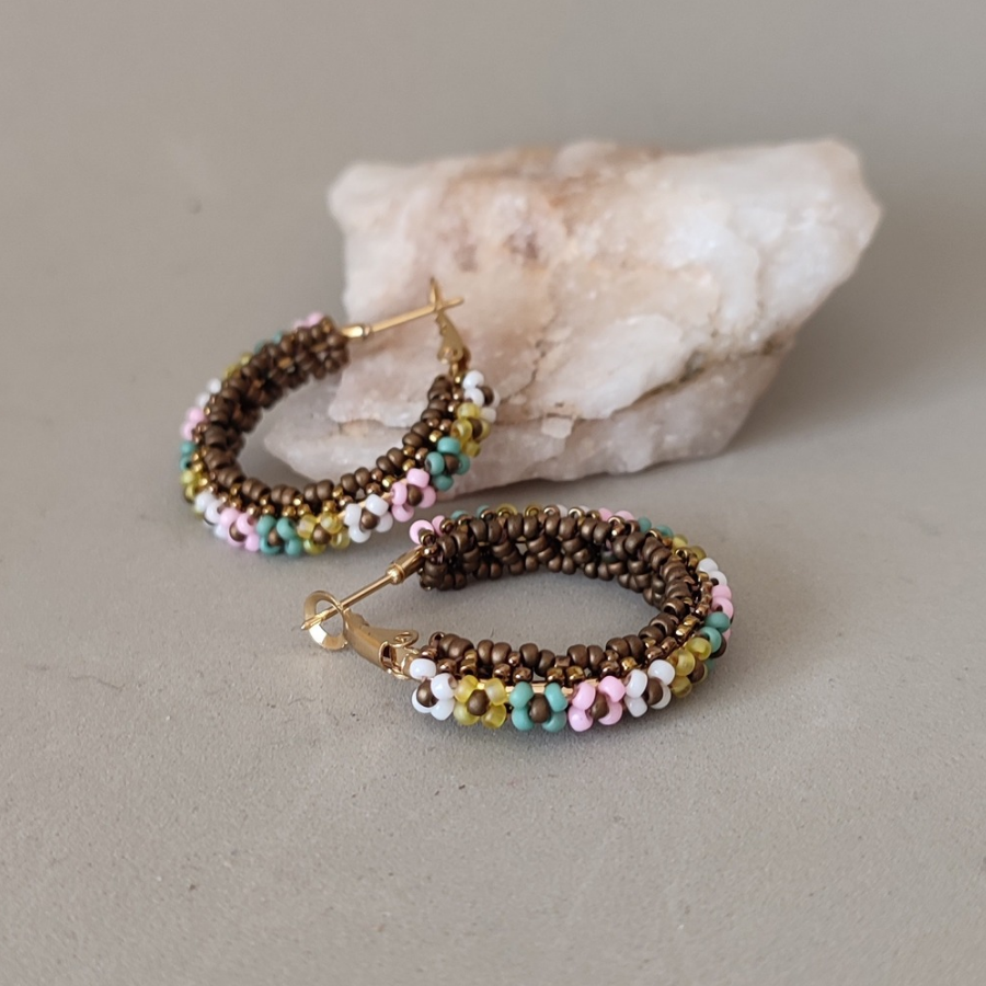 Aros tejidos a mano con cristales japoneses de alta calidad. Base color bronce con flores multicolor — blanco, rosa, verde y amarillo.