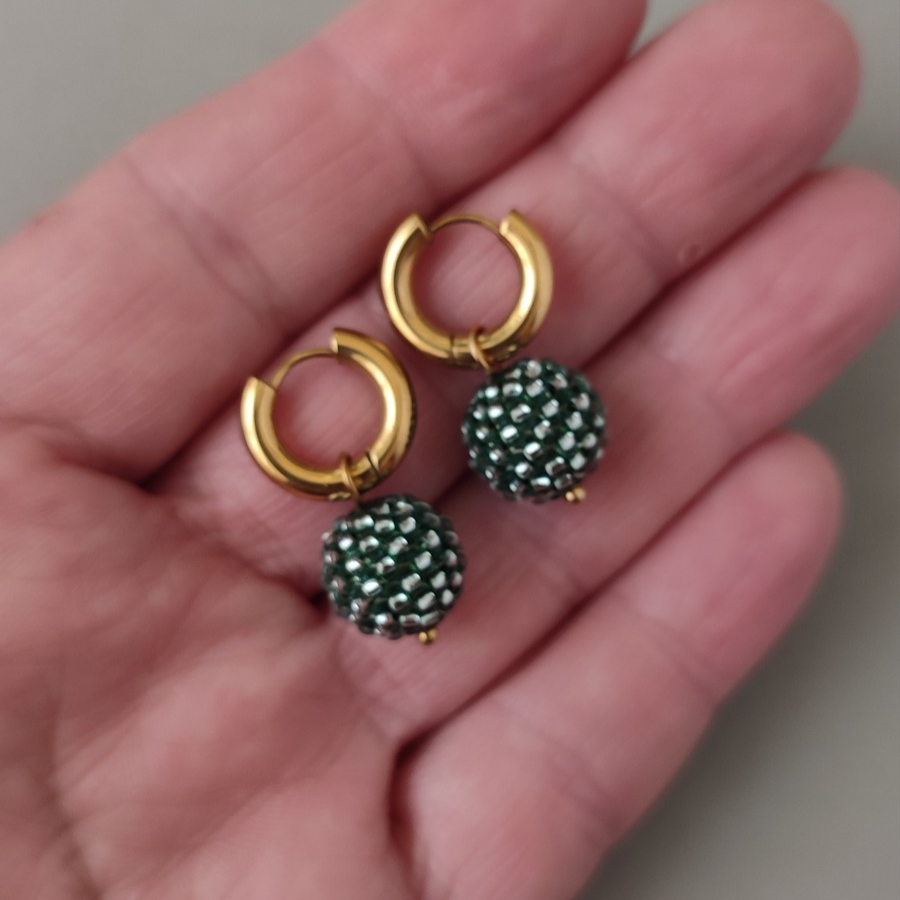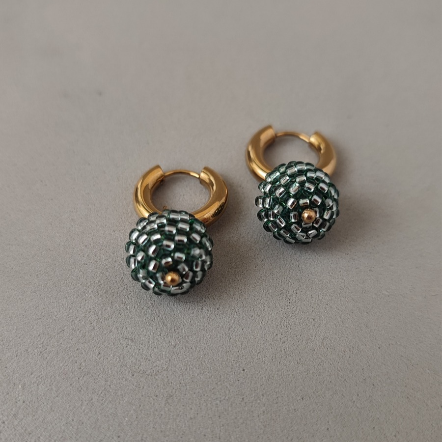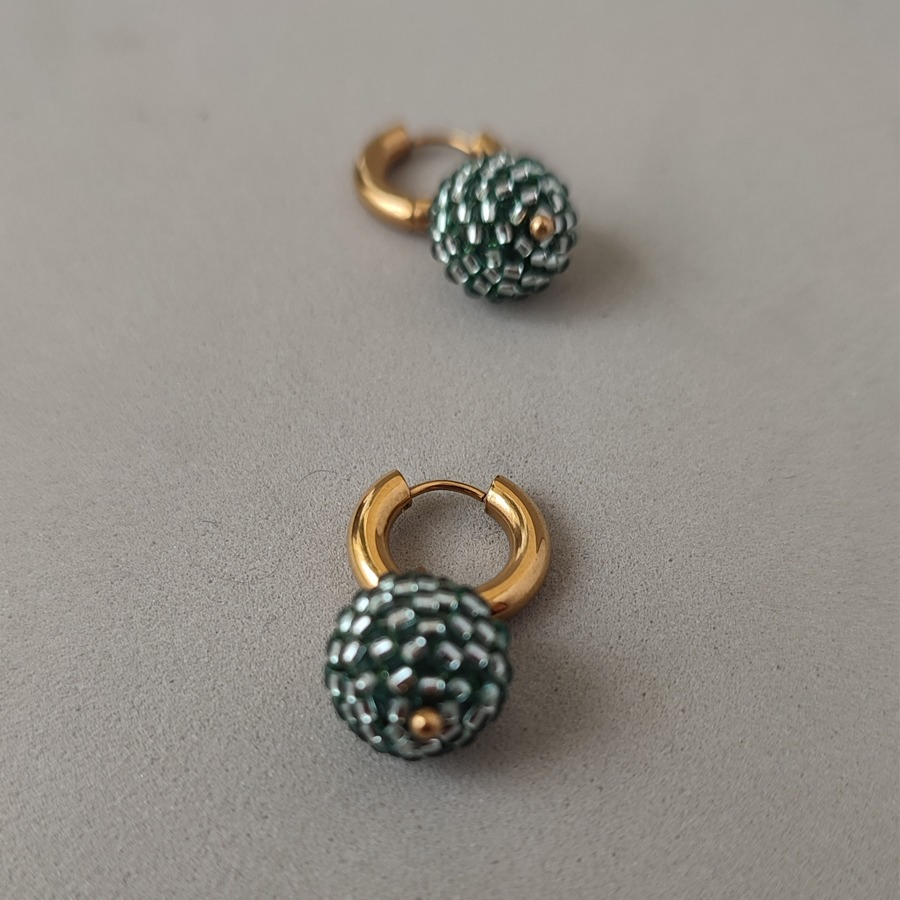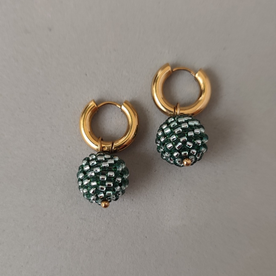 Pendientes de aro dorado con bolas de abalorios verde, tejidas a mano. Elegantes, ligeros y perfectos para un estilo natural y romántico.