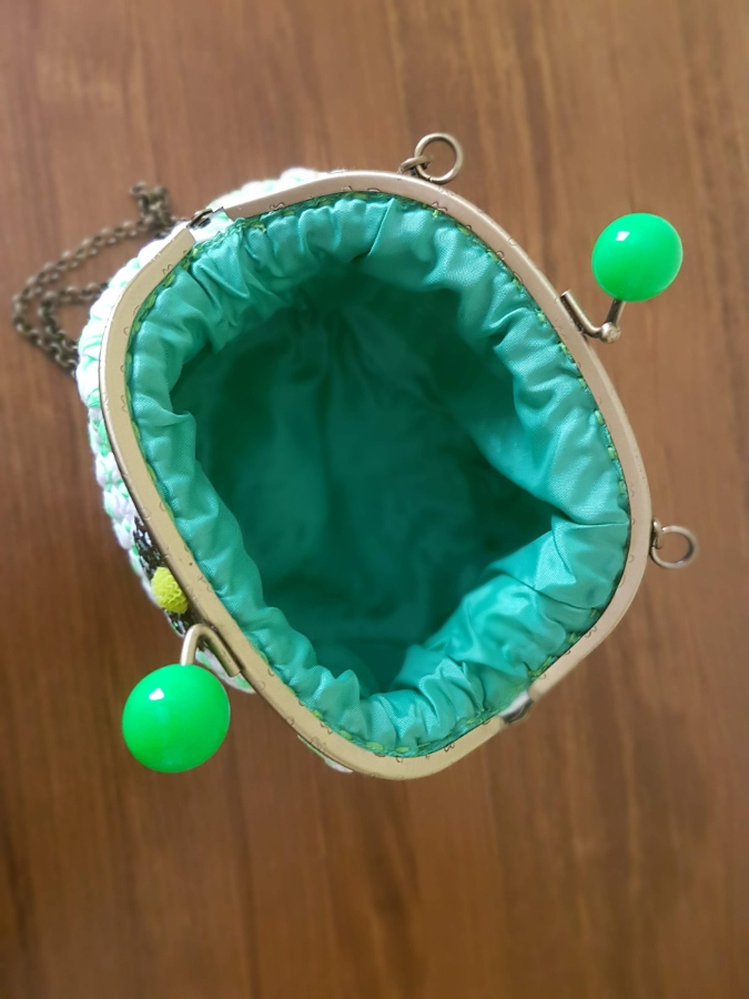 Con boquilla color latón de 16.5cm, realizado en ganchillo. Interior forrado y cadena de 120cm regulable.