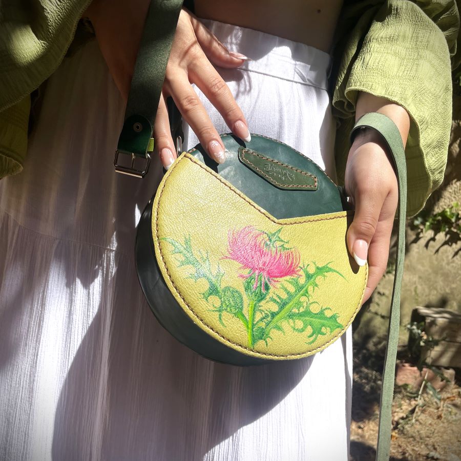 El bolsillo exterior, realizado en piel verde más clara, está decorado con un cardo pintado a mano utilizando pintura especial para cuero. Estos detalles convierten cada Alamar en una pieza única e irrepetible.