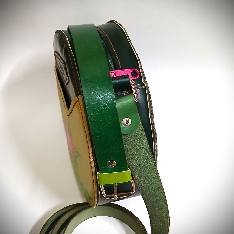 Este bolso redondo de cuero verde está hecho y cosido a mano en mi taller Alamares, cuidando cada detalle y respetando el ritmo del trabajo artesano.