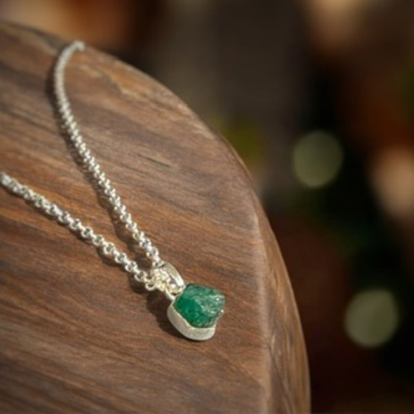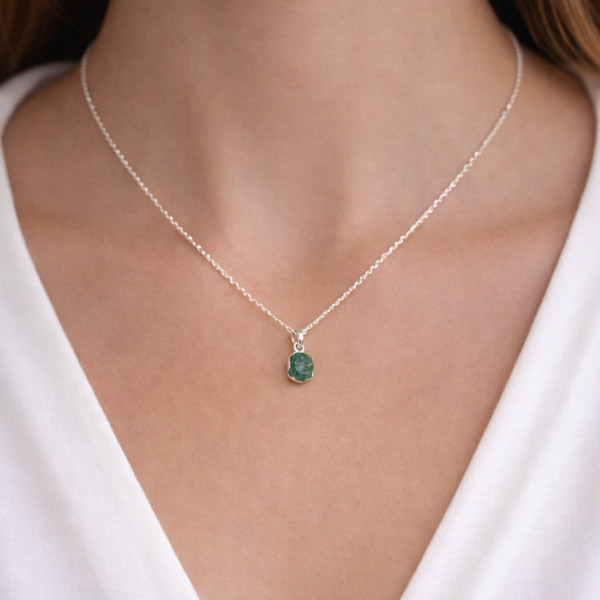 El Colgante de Esmeralda es una joya artesanal de Plata de Primera Ley 925, con una piedra de esmeralda en bruto de aproximadamente 8 × 8 mm. Su tamaño discreto y ligero lo hace perfecto como colgante pequeño de esmeralda, ideal para usar a diario o combinar con otras joyas sin sobrecargar tu look.