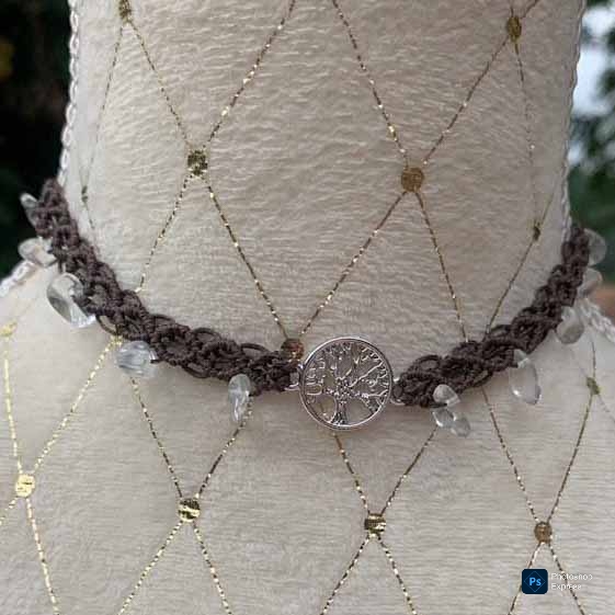 Colar artesanal de macramé – estilo único y natural, elaborado con hilo acerado de 1mm, con cuentas de piedra natural y dije de acero con el árbol de la vida.