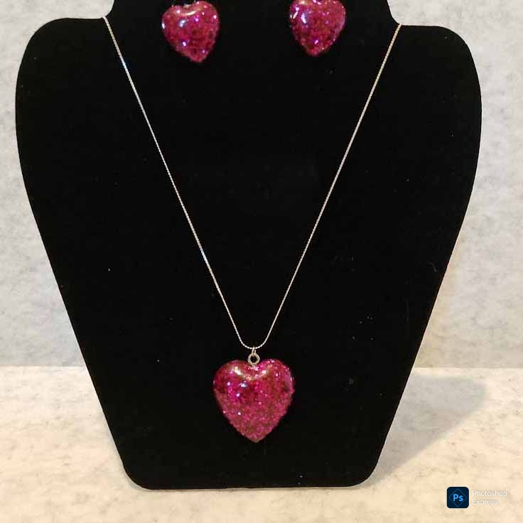 Describe este elegante conjunto de pendientes y collar elaborados con resina UV en forma de corazón con purpurina, diseñados para capturar la luz y destacar en cualquier ocasión. Cada pieza está hecha a mano, cuidando cada detalle para crecer un acabado brillante y moderno.