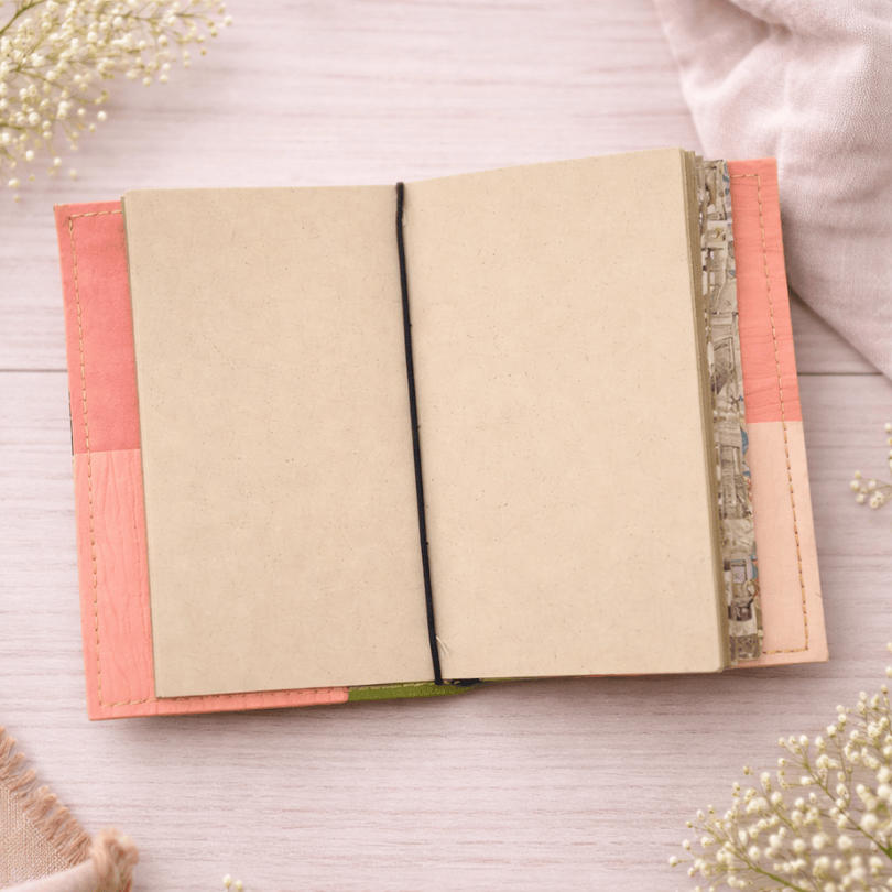 Cuaderno de Viaje Reciclado Rosa de Tapa Blanda con tres recambios, hecho a mano en España por Sonrisas de Ratona.
