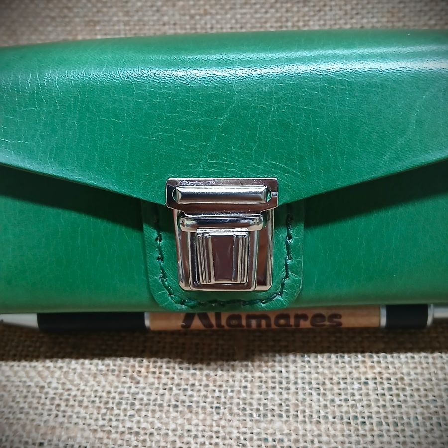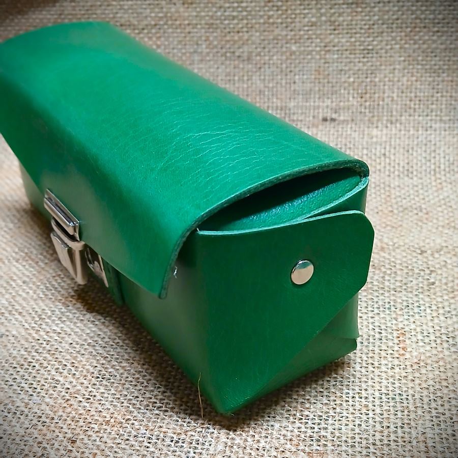 Este estuche de cuero verde está realizado de forma completamente artesanal, cuidando cada detalle para ofrecer una pieza práctica, resistente y atemporal.