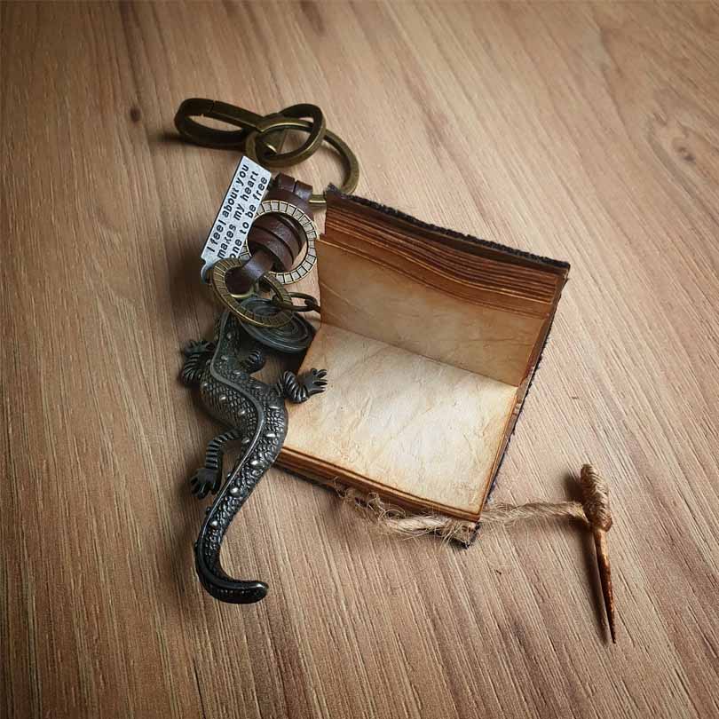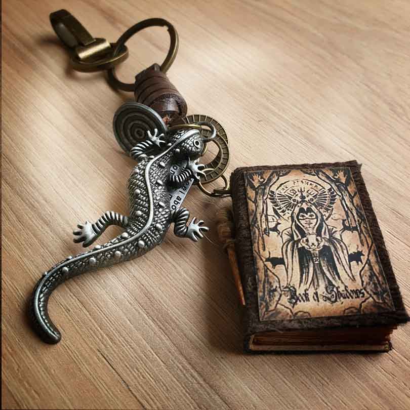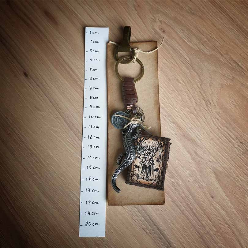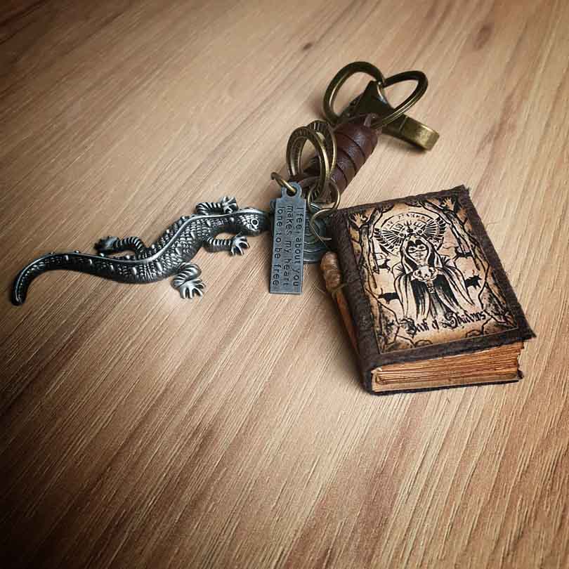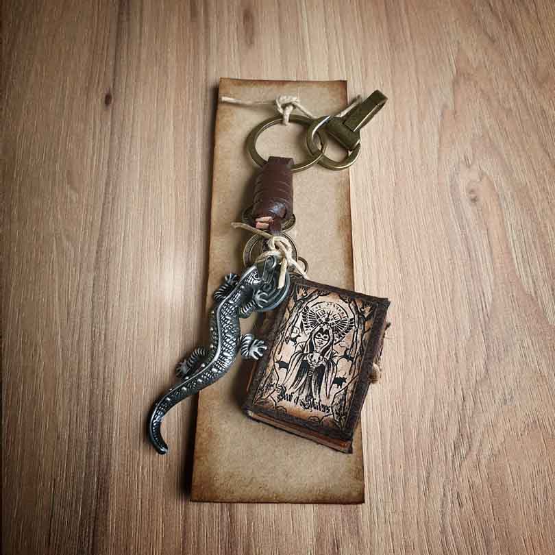 El llavero combina una figura de lagartija metálica con un mini grimorio realizado a mano, creado y ensamblado en mi taller.