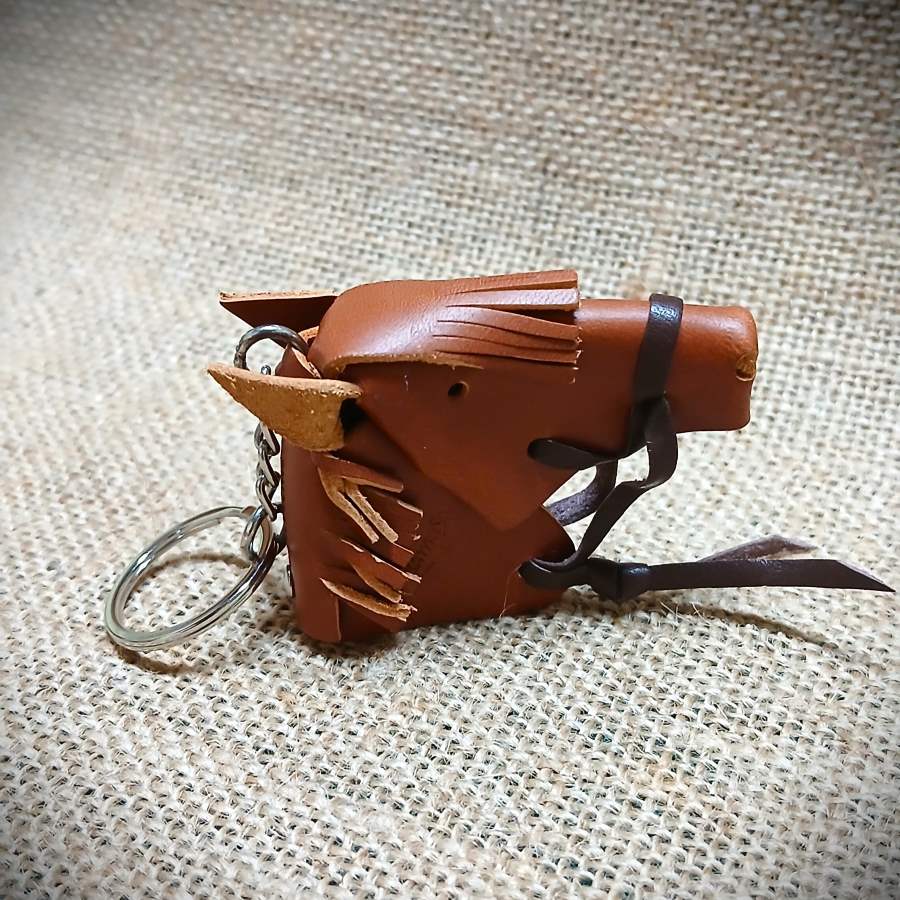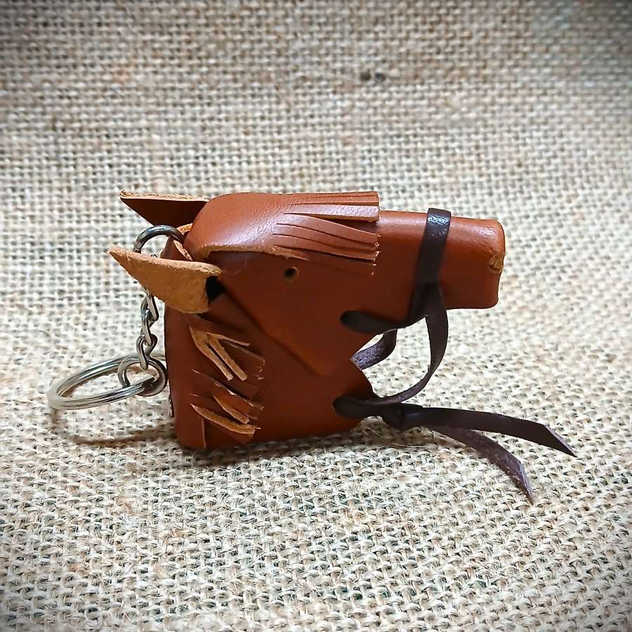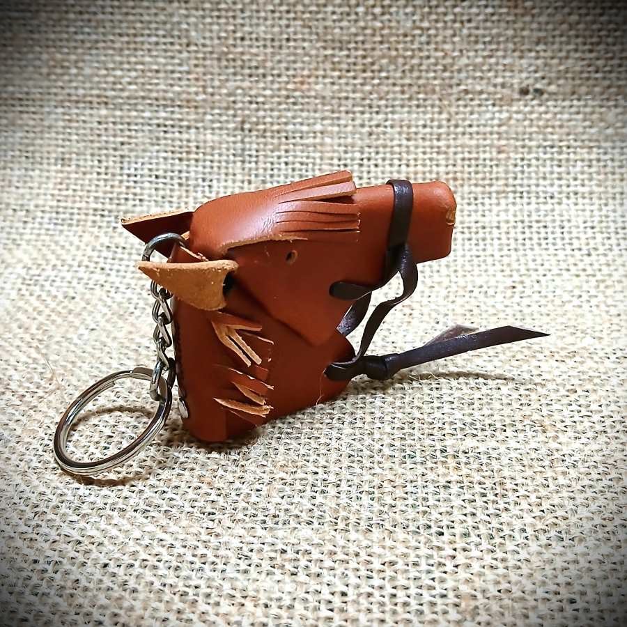 Este llavero está realizado a mano, moldeando el cuero mojado para darle la forma de la cabeza de un caballo.
