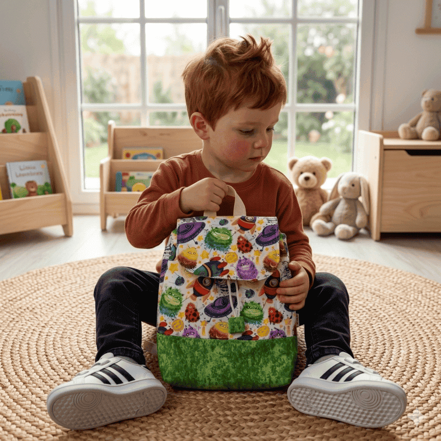 Mochila para Niños Personalizada Espacio modelo SOLAPA en tamaño MINI, ideal para guardería o escuela infantil. Hecha a mano en telas de algodón en el exterior, tejido impermeable en el interior y con nombre bordado a mano incluido.