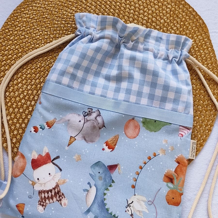 Mochila Saco Mini Infantil Dinosaurios personalizada, hecha a mano en telas de algodón, ligera, cómoda y única con nombre bordado.