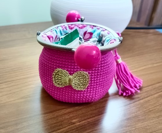 Monederos de ganchillo con boquilla color de latón de 8,5cm., tejido en ganchillo con hilo de algodón color fucsia con cerradura de clic e interior forrado.