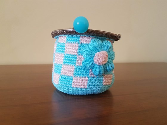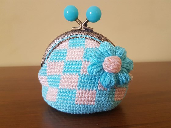 Monederos de ganchillo con boquilla color de latón de 8,5cm., tejido en ganchillo con hilo de algodón color turquesa y rosa con cerradura de clic e interior forrado.