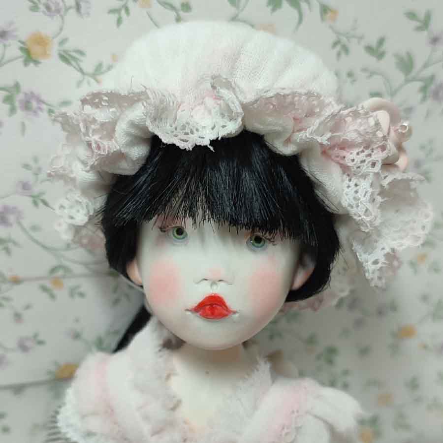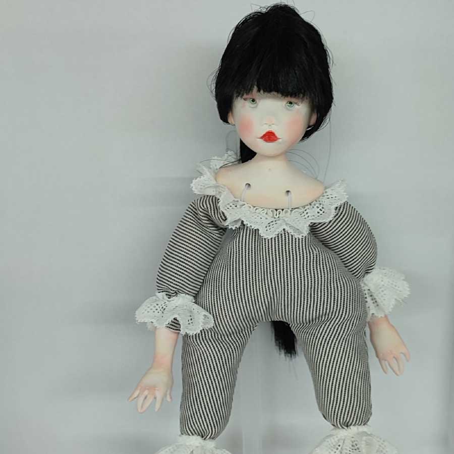 Muñeca de pelo oscuro con zapatillas hecha a mano en arcilla blanca y telas por Evaninas.