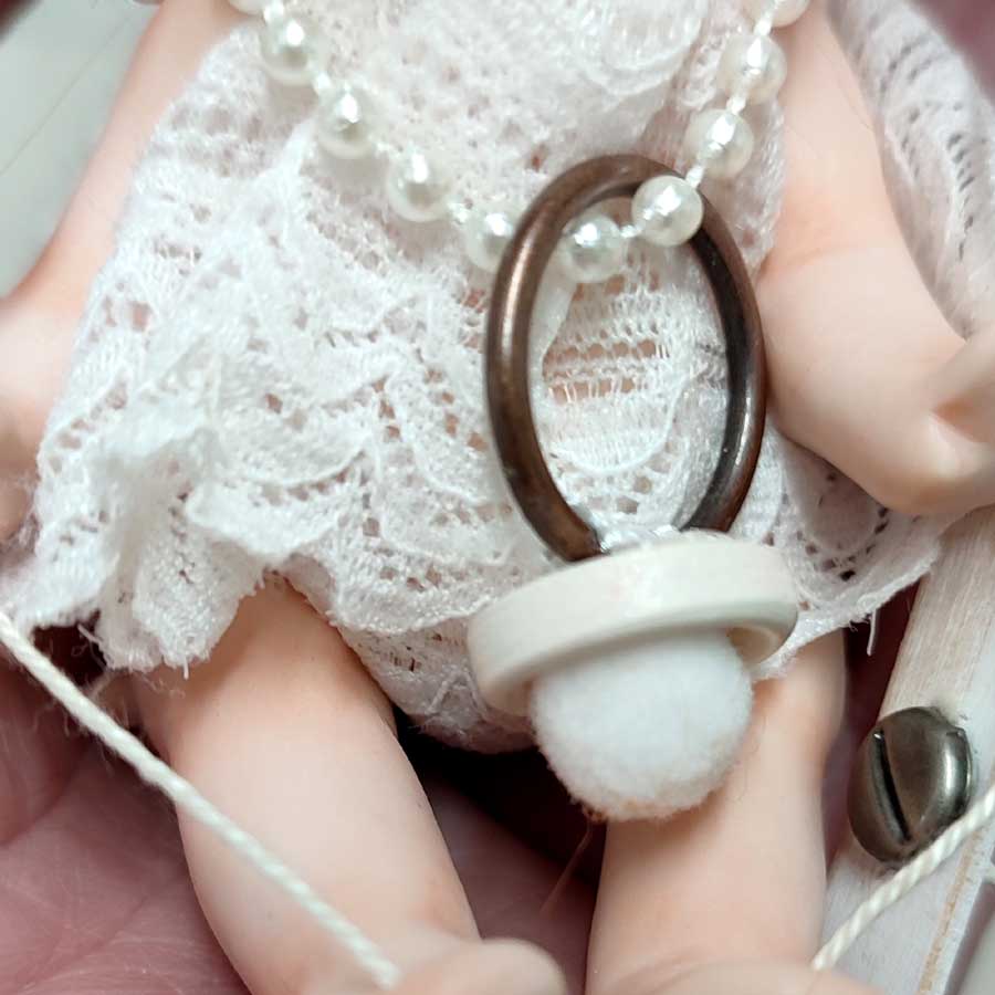 Es una pieza única y está hecha con arcilla polimérica, encaje elástico y alambre.