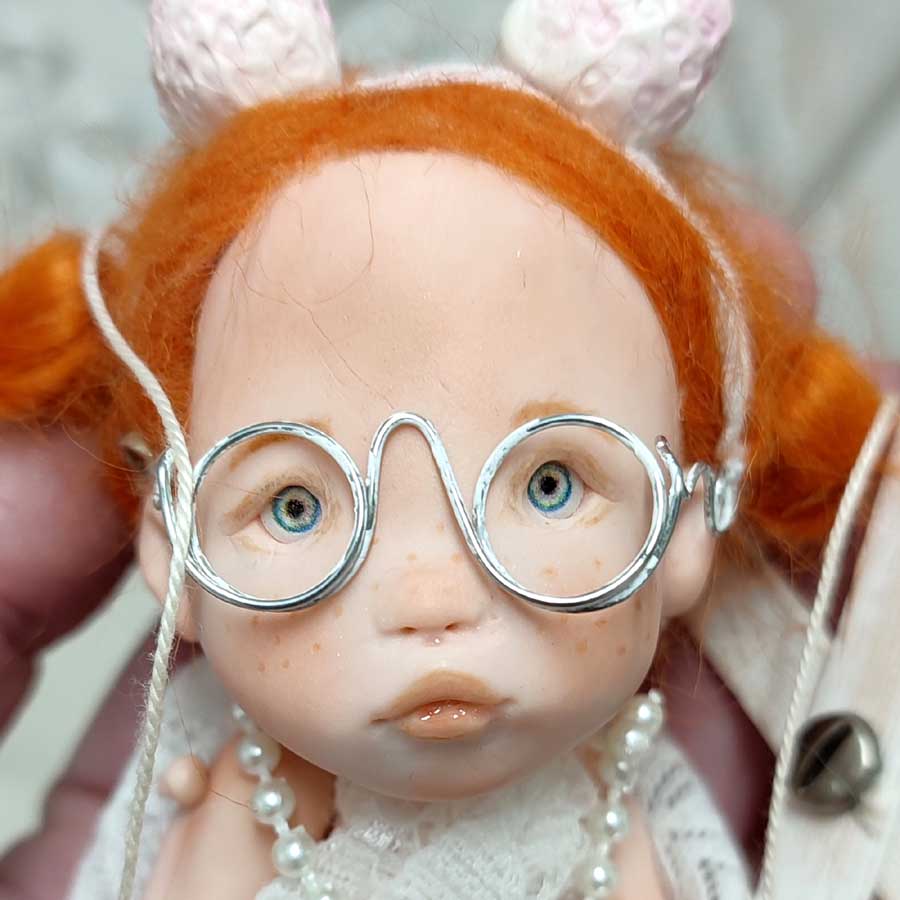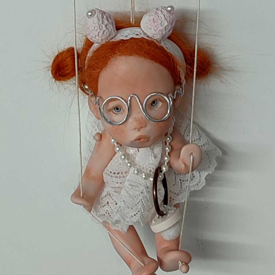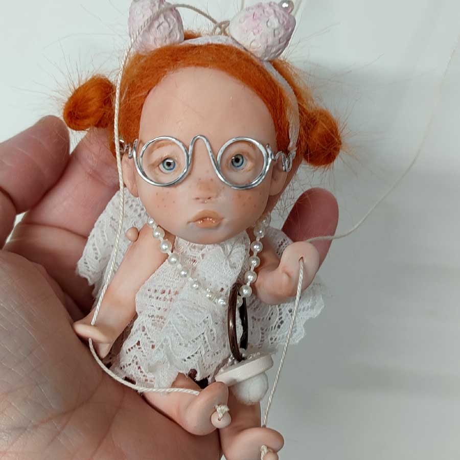 Muñeca marioneta con gafas hecha a mano en arcilla polimérica por Evaninas.