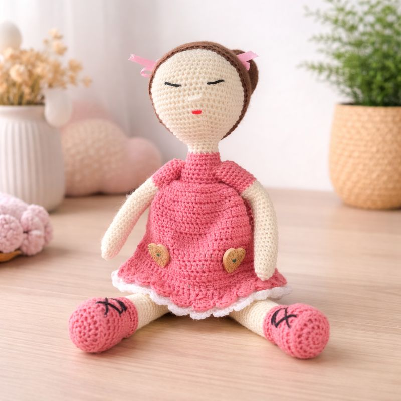 Muñeca en crochet con dos moñitos tejida en crochet en algodón y rellena de fibra miraguano
