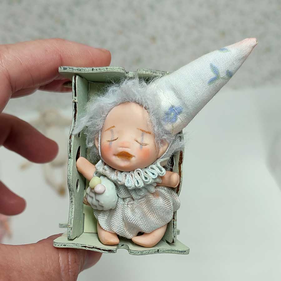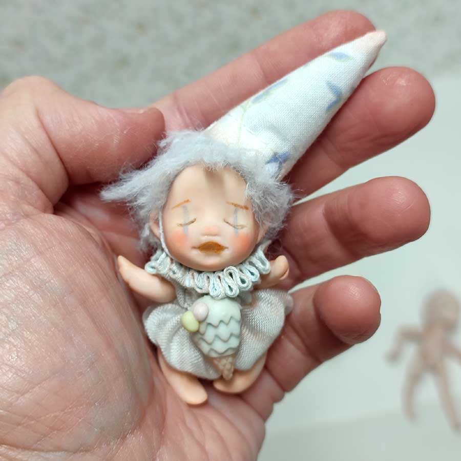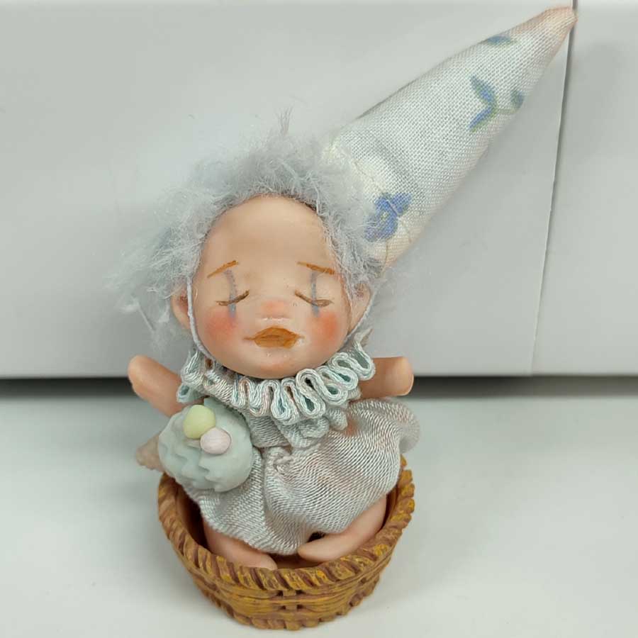 Esta muñeca mide unos 6,5 cm. sin el gorro. Está modelada por piezas en arcilla polimérica y están unidas por hilos elásticos, por lo que las piernas y los brazos se mueven. Lleva un pantalón de cinta de tul igual que su cuello fruncido. El sombrero se puede quitar.