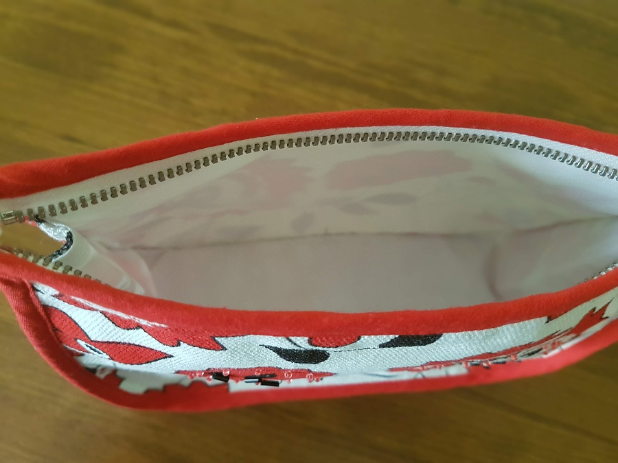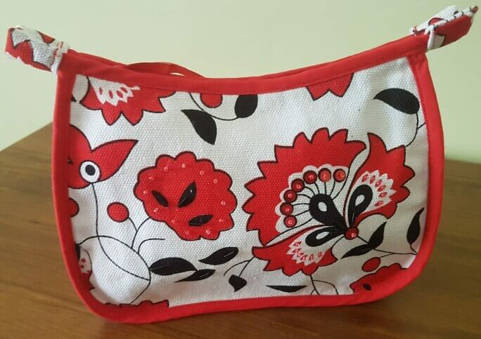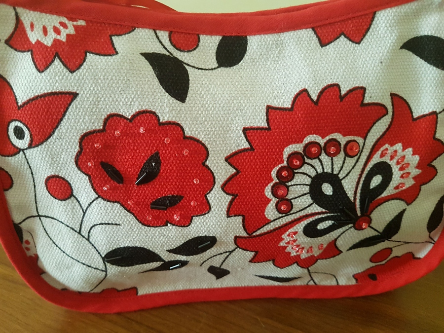 Cremallera de 20cm, interior forrado en tela de algodón, decorado lentejuelas y mostacillas.
