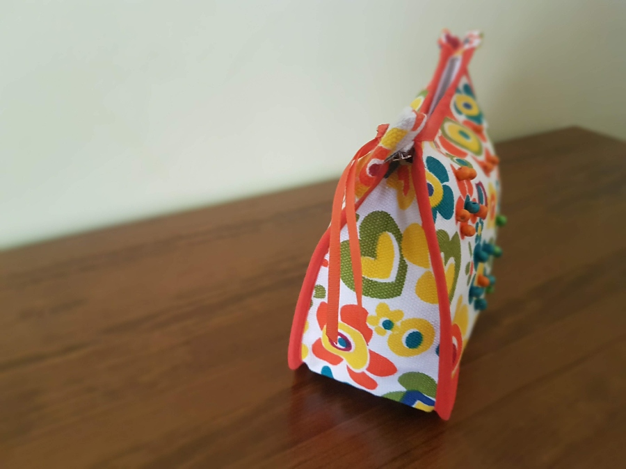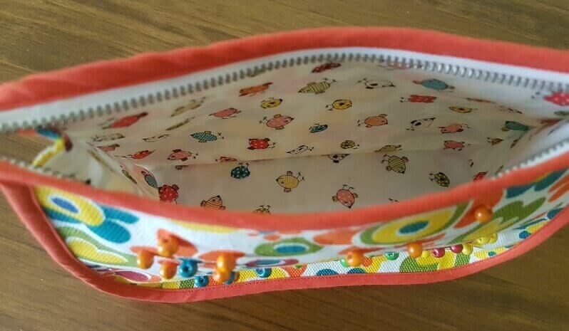 Cremallera de 20cm, interior forrado en tela de algodón, decorado cuentas de madera.