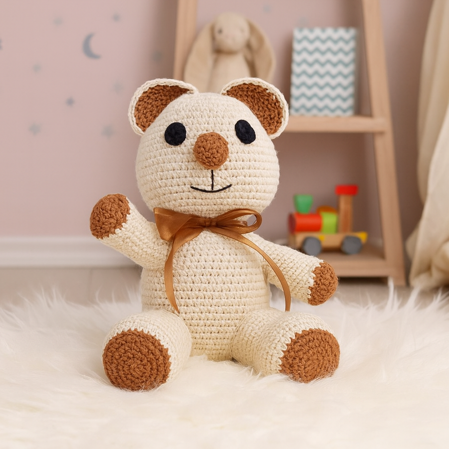 Un osito clásico, dulce y lleno de encanto artesanal, perfecto para regalar o para convertirse en el primer amigo inseparable de casa.