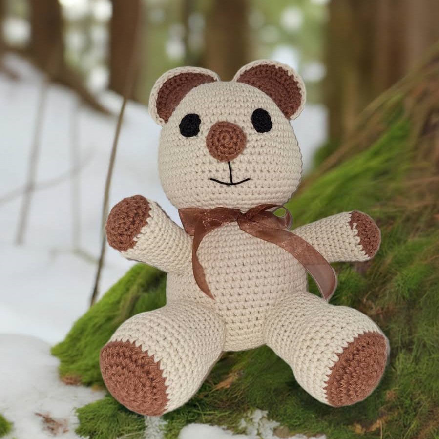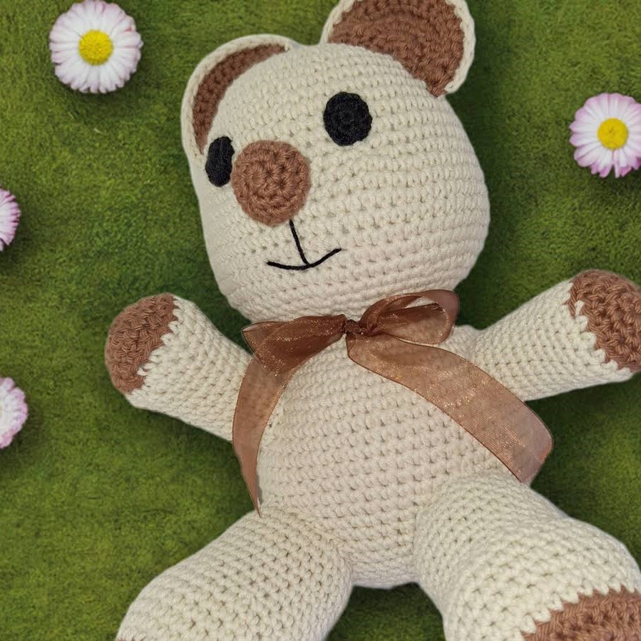 Osito hecho en crochet, tejido en suave algodón y relleno de amor y fibra de miraguano. Apto para bebés y mayores, no contiene piezas pequeñas.