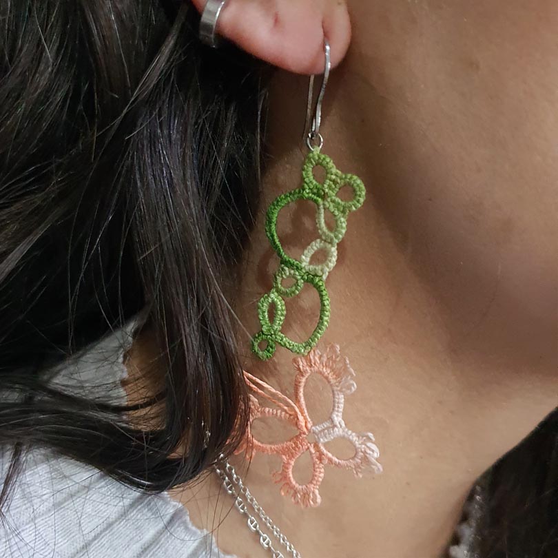 Pendientes largos artesanales realizados a mano con la técnica de frivolité, inspirados en la ligereza y el color de la primavera.