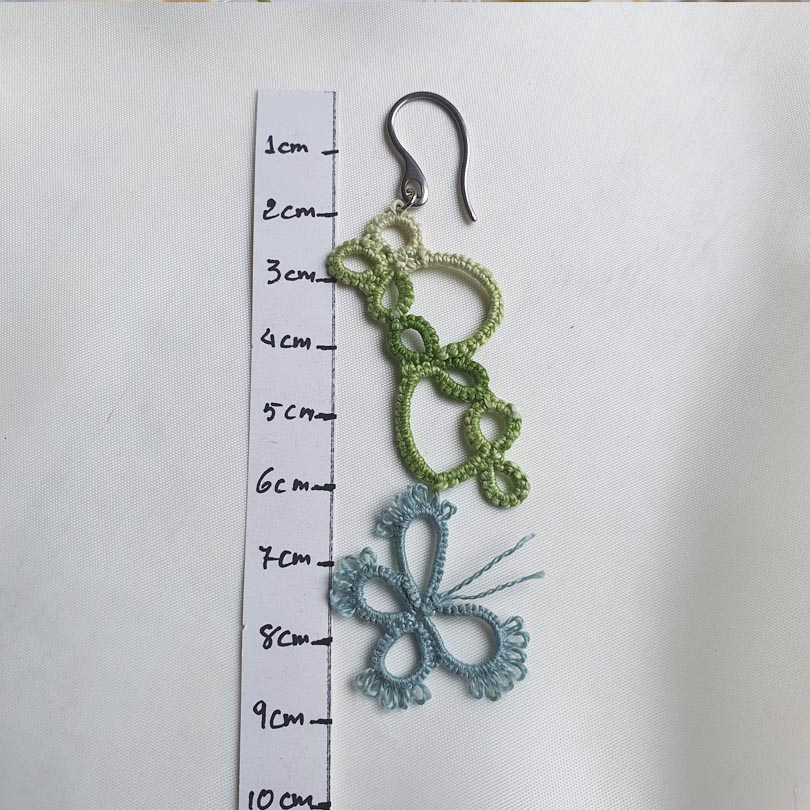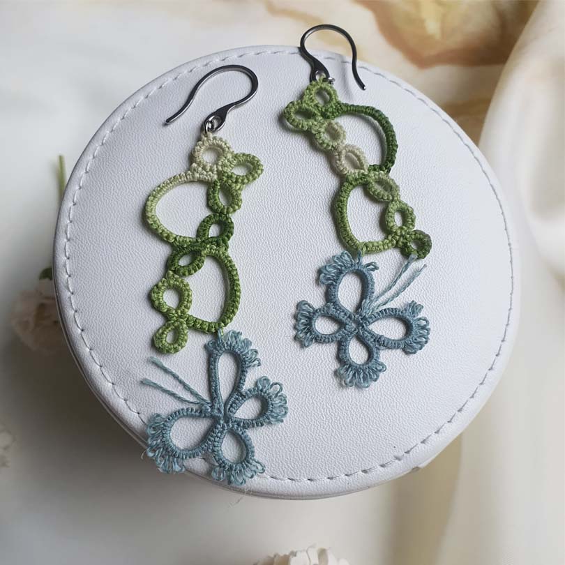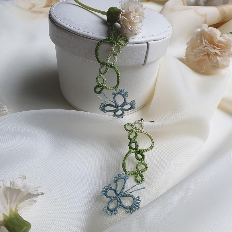 Pendientes largos artesanales realizados a mano con la técnica de frivolité, inspirados en la calma y la frescura de los primeros días de primavera.