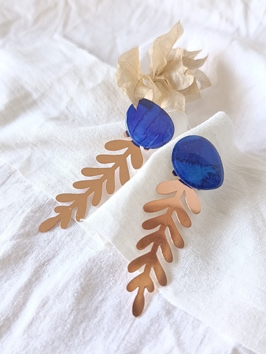 Pendientes formados por una pieza de formas redondeadas pintada a mano con acuarela en color añil, complementado con una pieza metálica en cobre, que puede quitarse y lucir sólo la pieza azul. Dos pendientes en uno para combinarlos que todas las ocasiones que lo desees.