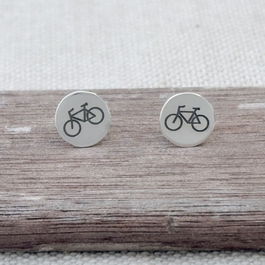 Pendientes redondos de 11 mm en plata de ley 925 con una bicicleta grabada en su interior.