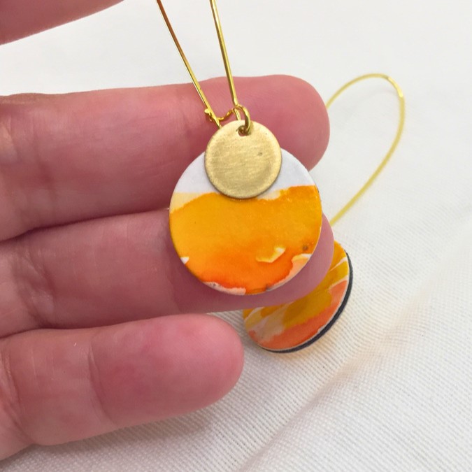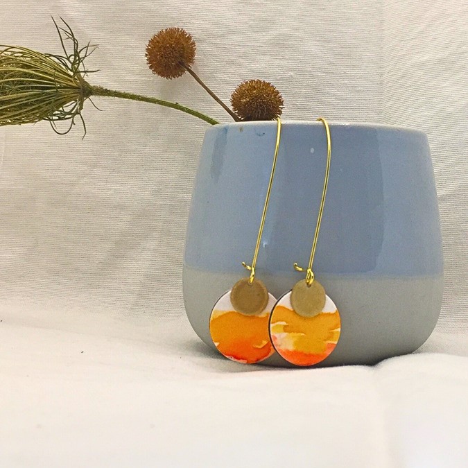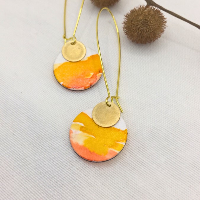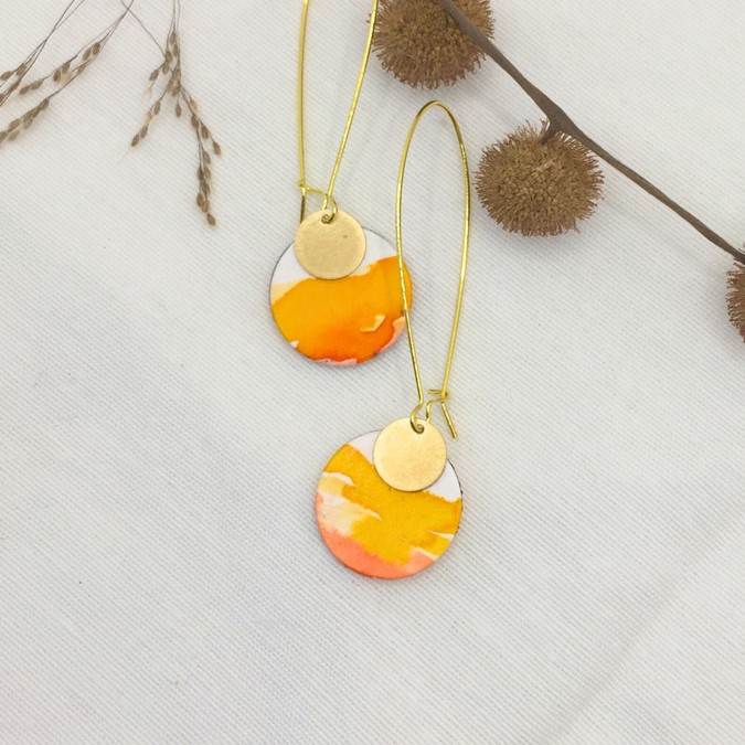 El calor del sol de un amanecer de invierno. Esto es lo que representa estos pendientes artesanales pintados a mano con  acuarelas. Colores cálidos para días fríos, o de verano.