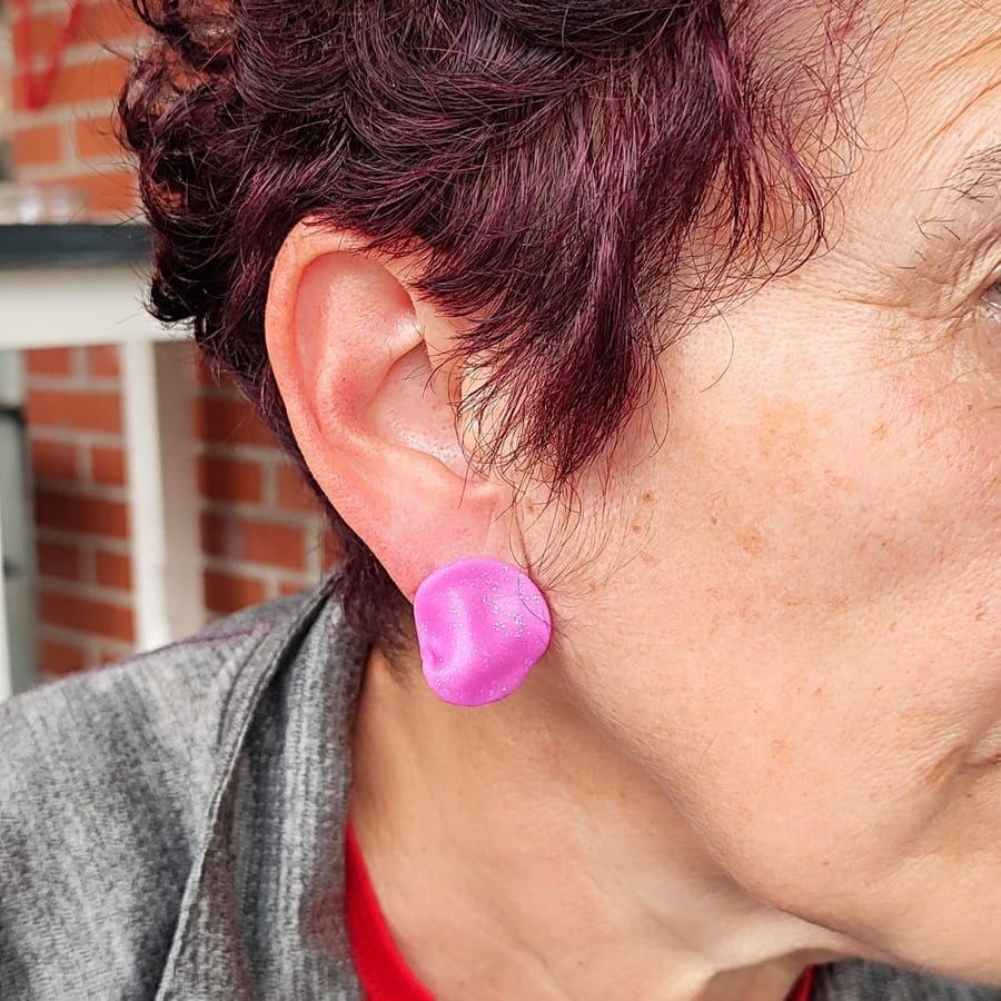 Pendientes redondos rosas con forma de una duna. Son de botón con cierre de acero inoxidable.