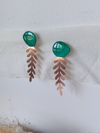 Pendientes verde esmeralda pieza metálica en forma de ramita en cobre.
