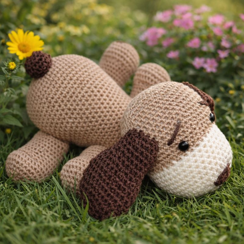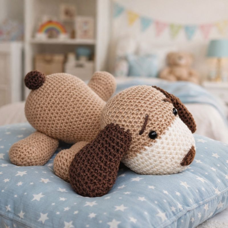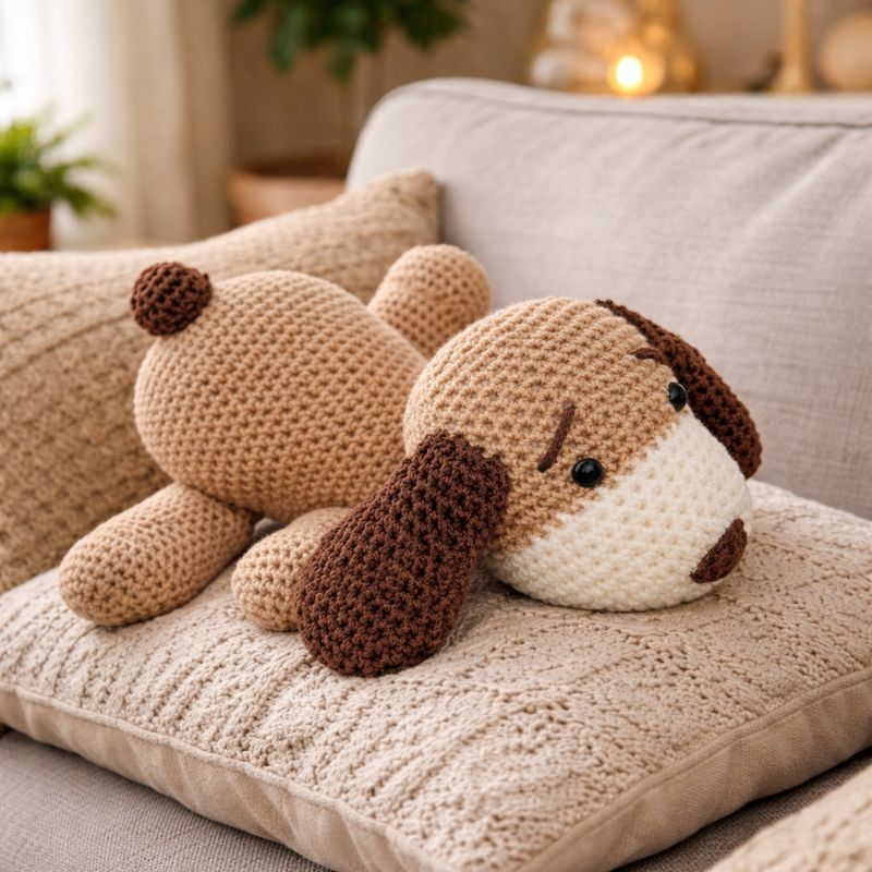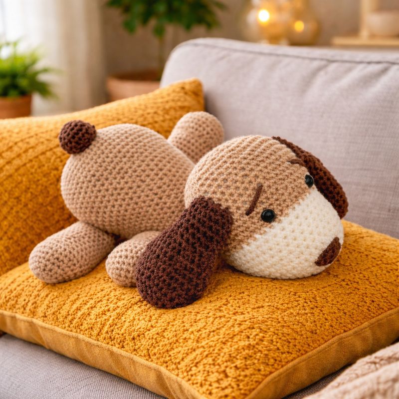 Conoce a Pelusín, un adorable perrito de crochet que se pasa el día tumbado boca abajo, espatarrado y feliz de la vida. Hecho completamente a mano con mucho mimo, Pelusín está listo para robarte una sonrisa (o varias).
