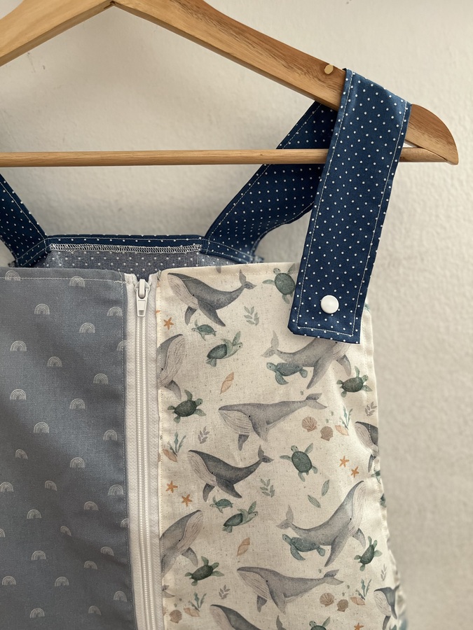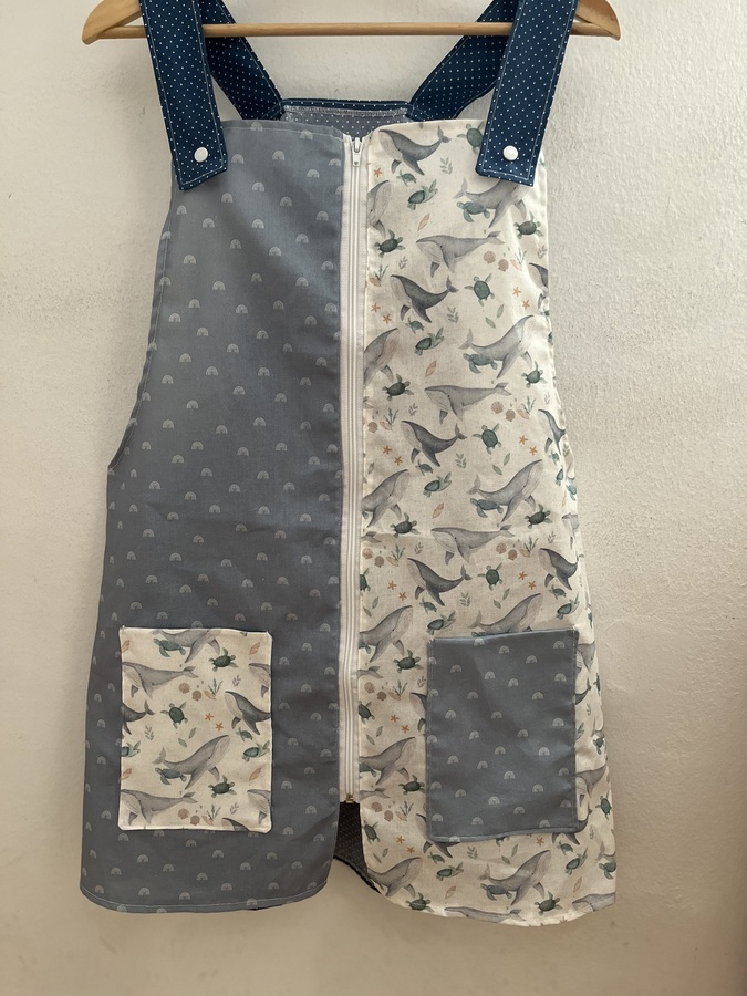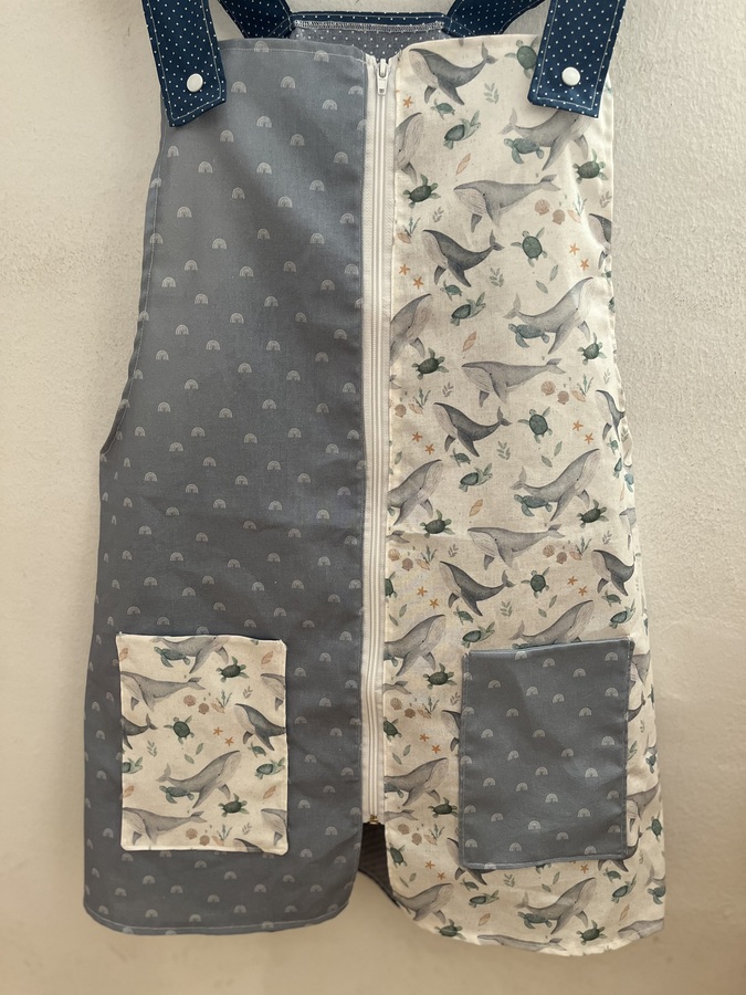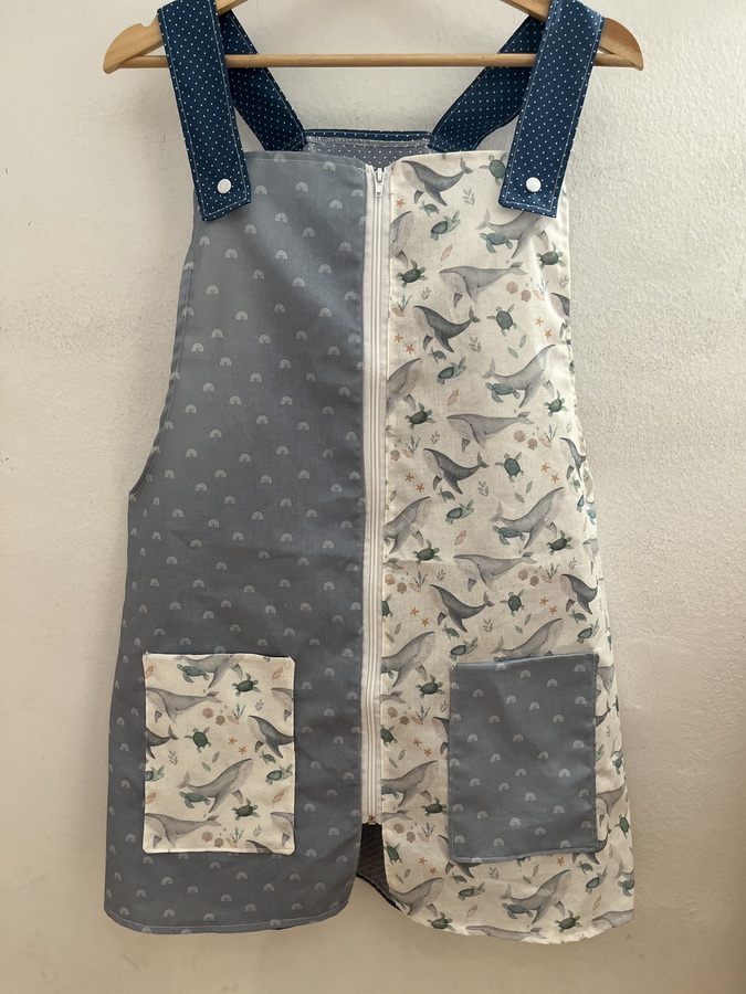 Este pichi maestra está pensado como bata para las maestras y está hecho con diferentes telas de algodón estampadas y combinadas.