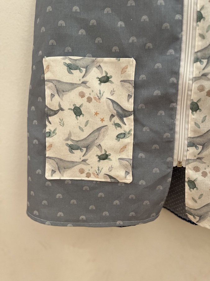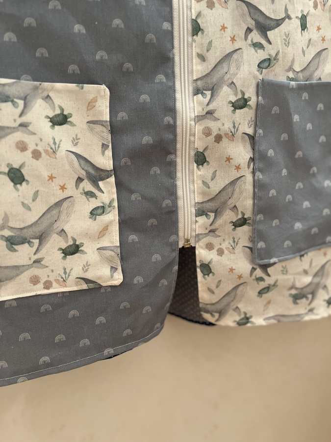 Lleva una cremallera delantera y dos bolsillos.