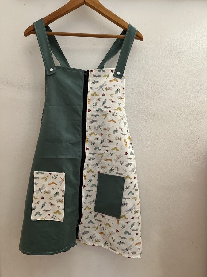 Este pichi maestra está pensado como bata para las maestras y está hecho con diferentes telas de algodón estampadas y combinadas.
