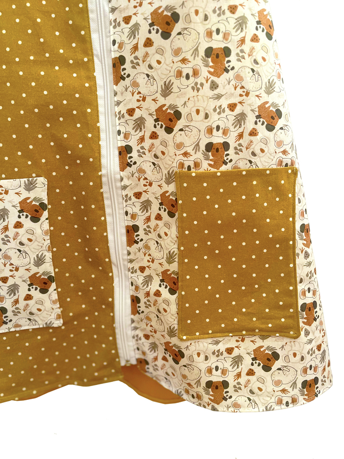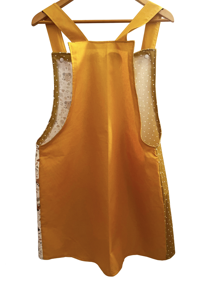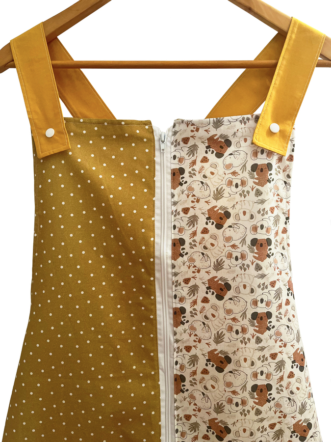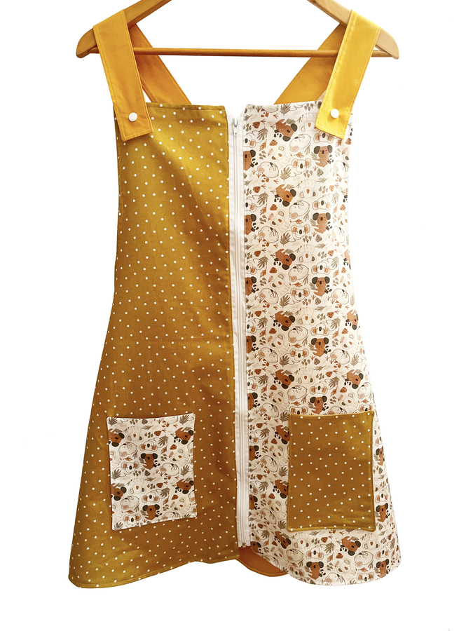 Este pichi maestra está pensado como bata para las maestras y está hecho con diferentes telas de algodón estampadas y combinadas.