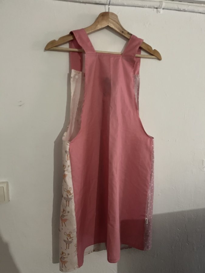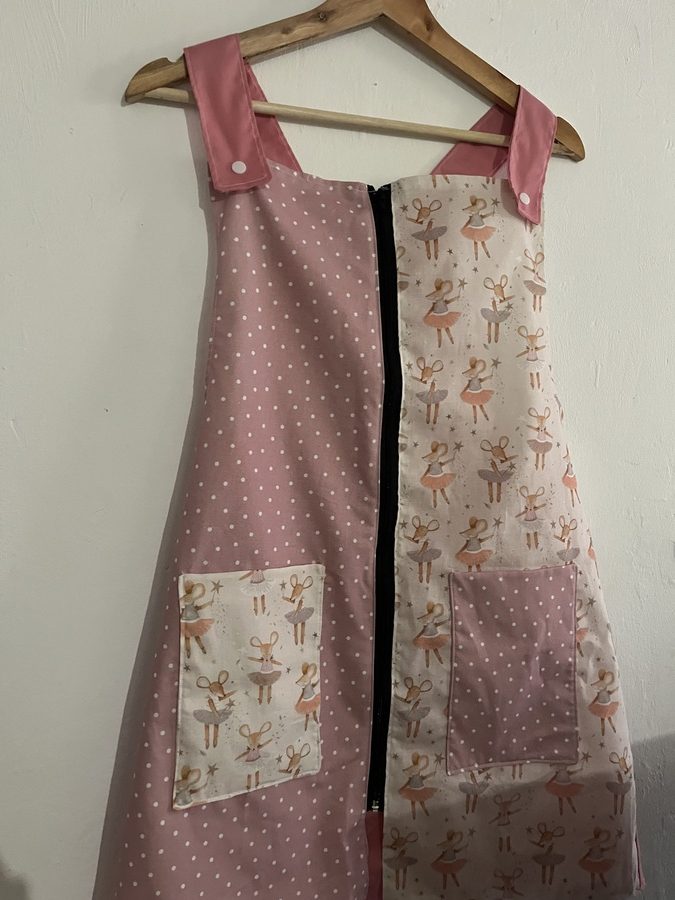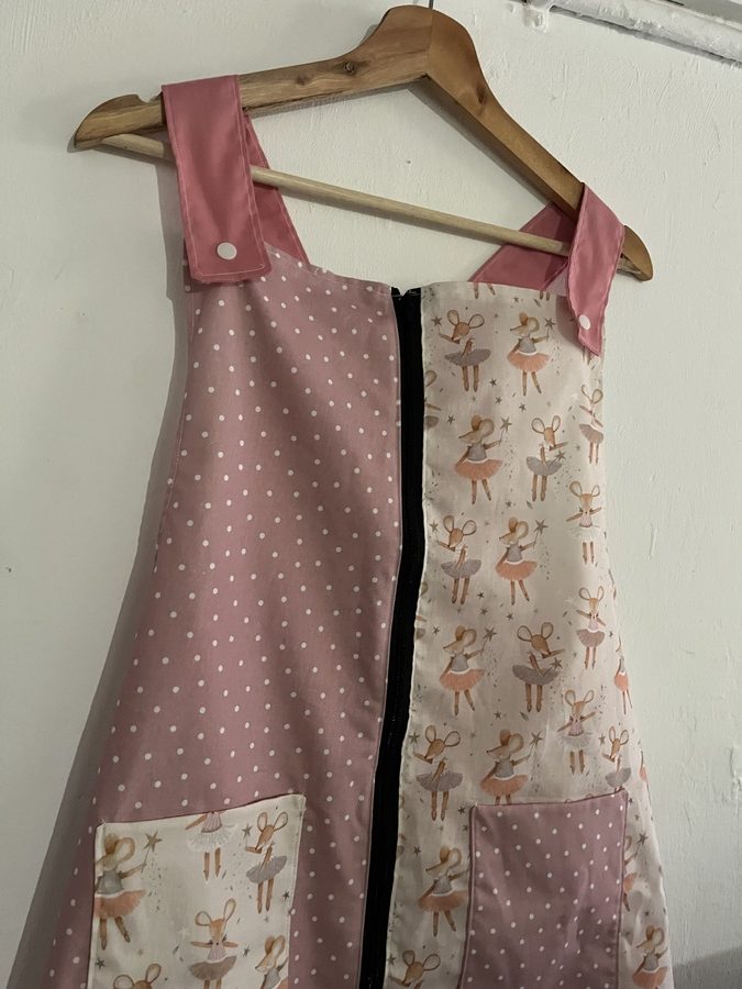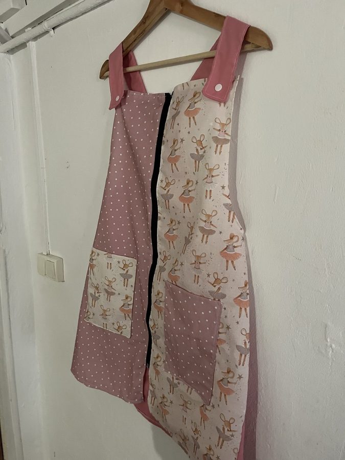 Este pichi maestra está pensado como bata para las maestras y está hecho con diferentes telas de algodón estampadas y combinadas.