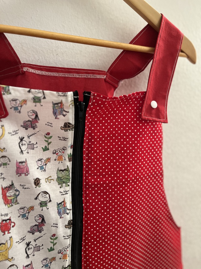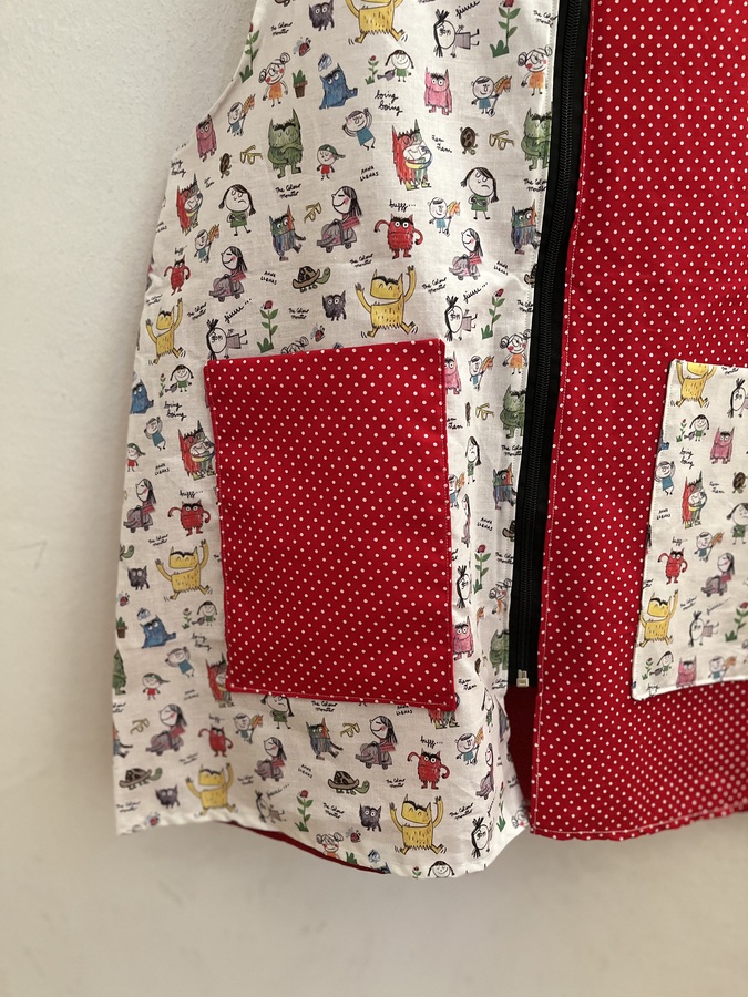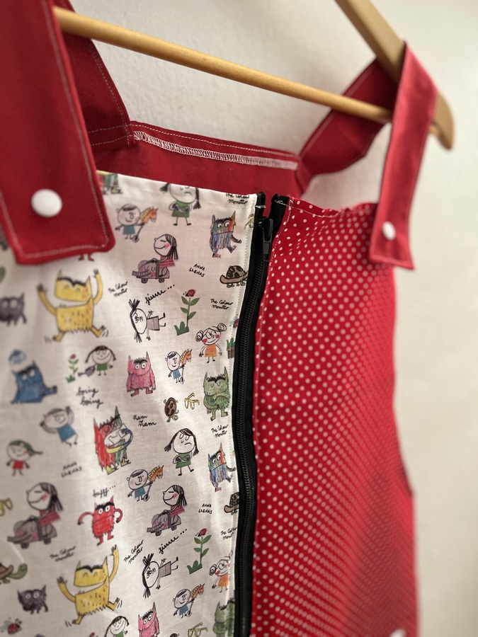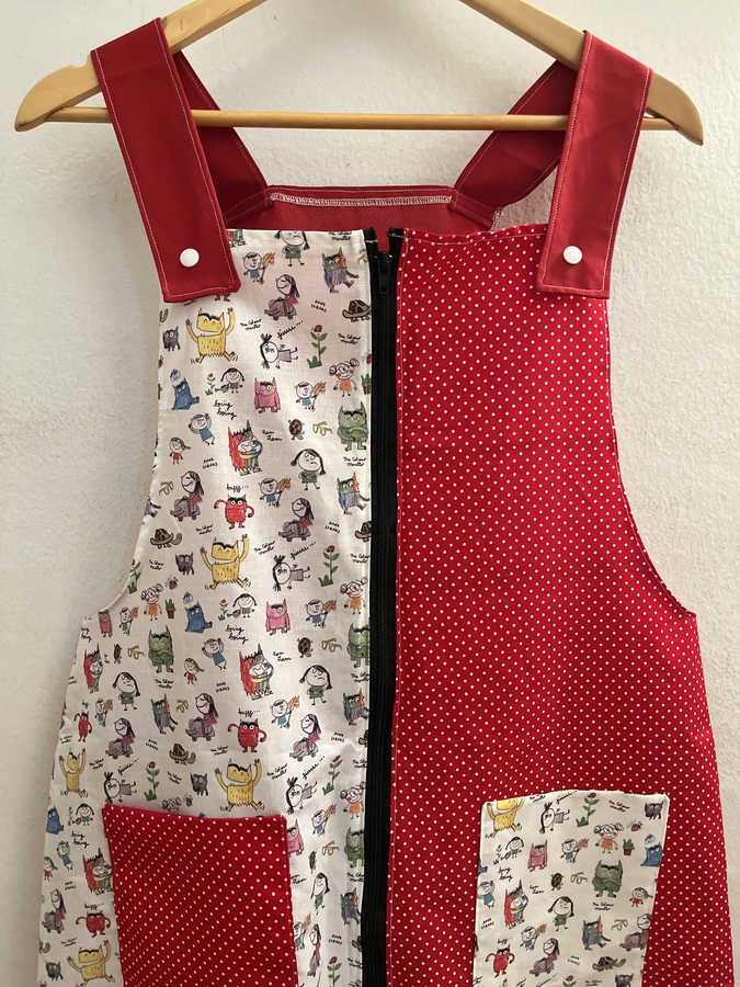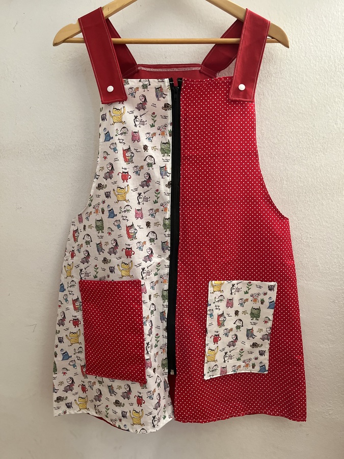 Este pichi maestra está pensado como bata para las maestras y está hecho con diferentes telas de algodón estampadas y combinadas.