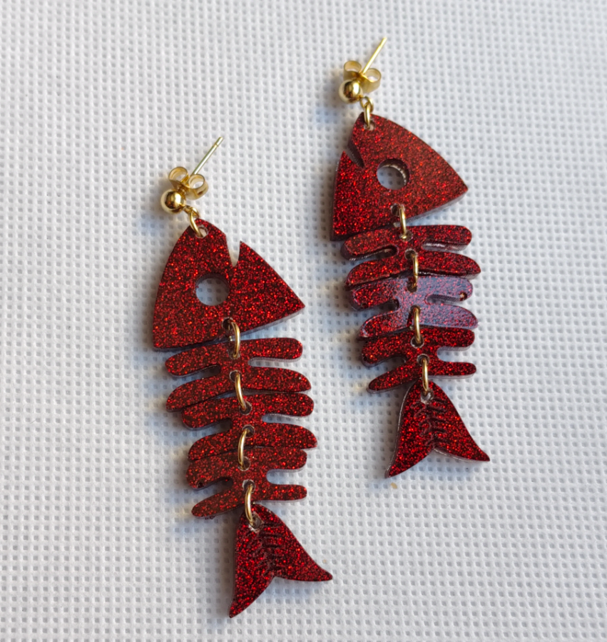pendientes de resina epoxi en forma de raspa color rojo y perno hipoalergenico