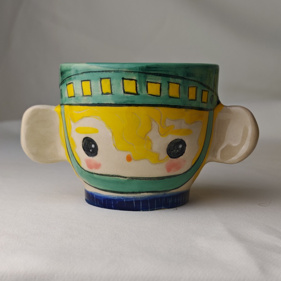 Esta taza ilustrada tiene un rostro en tonos vibrantes y orejas esculpidas que funcionan como asas. Su expresión sencilla y su carácter lúdico evocan el mundo de los libros ilustrados y en personajes clásicos como San Jorge, convirtiéndola en una pieza con alma escultórica.
