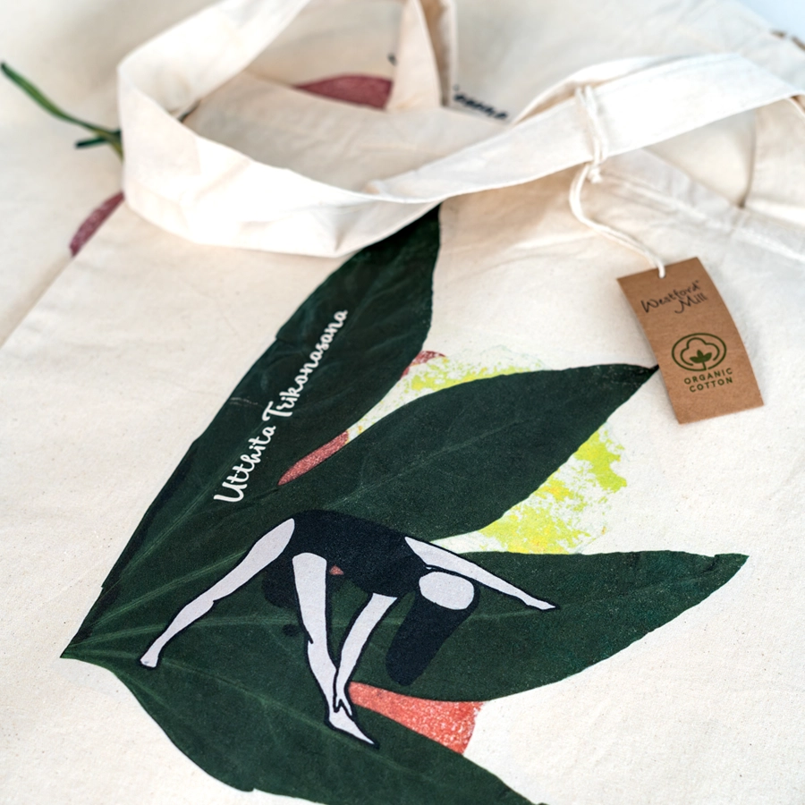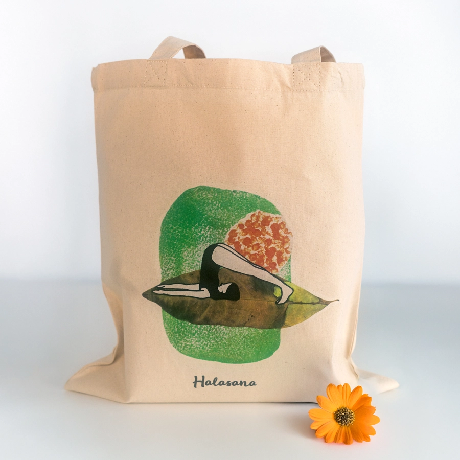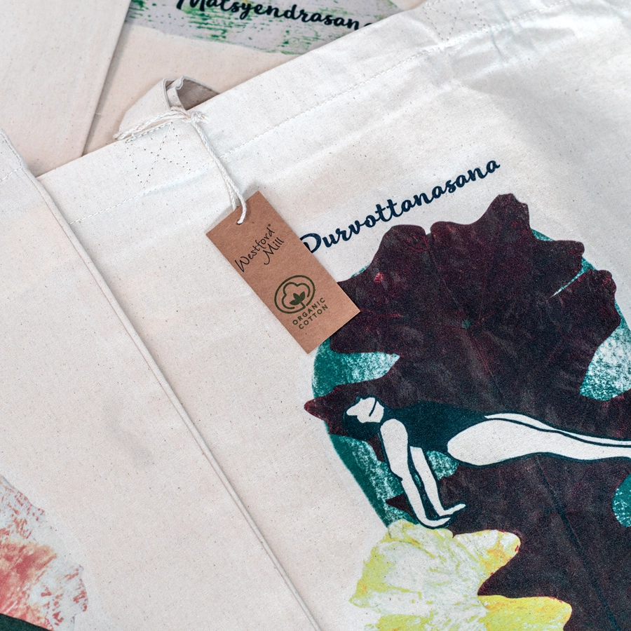 Tote bags algodón orgánico impresas con ilustraciones de posturas de yoga